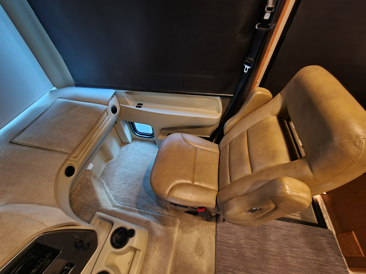 Living Area: L-shaped sofa with optional bed conversion, swiveling captain's chairs, optional fireplace