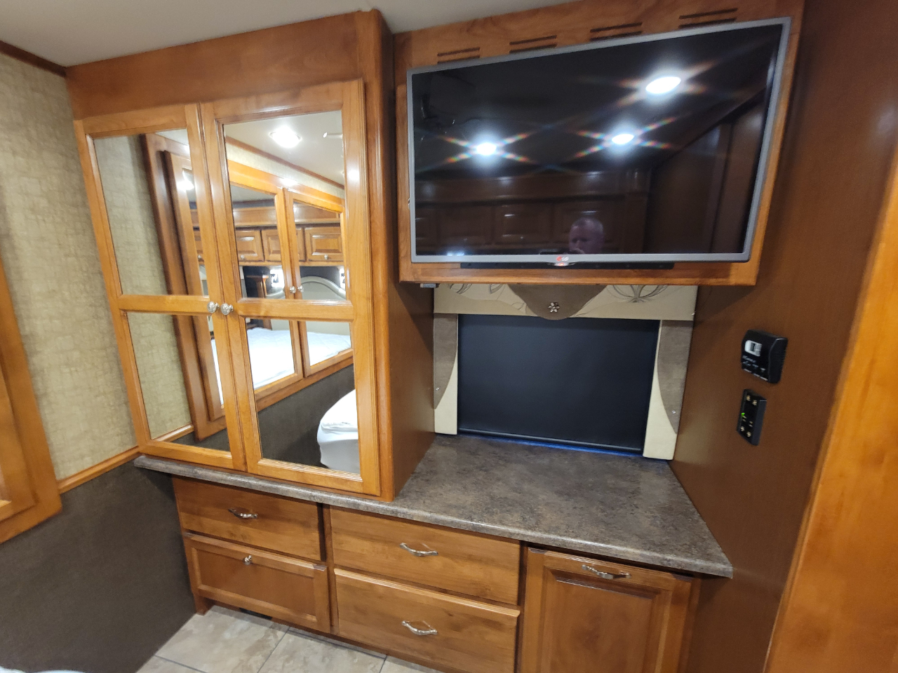 Bedroom: Queen-size bed, overhead storage, dresser, and wall-mounted TV